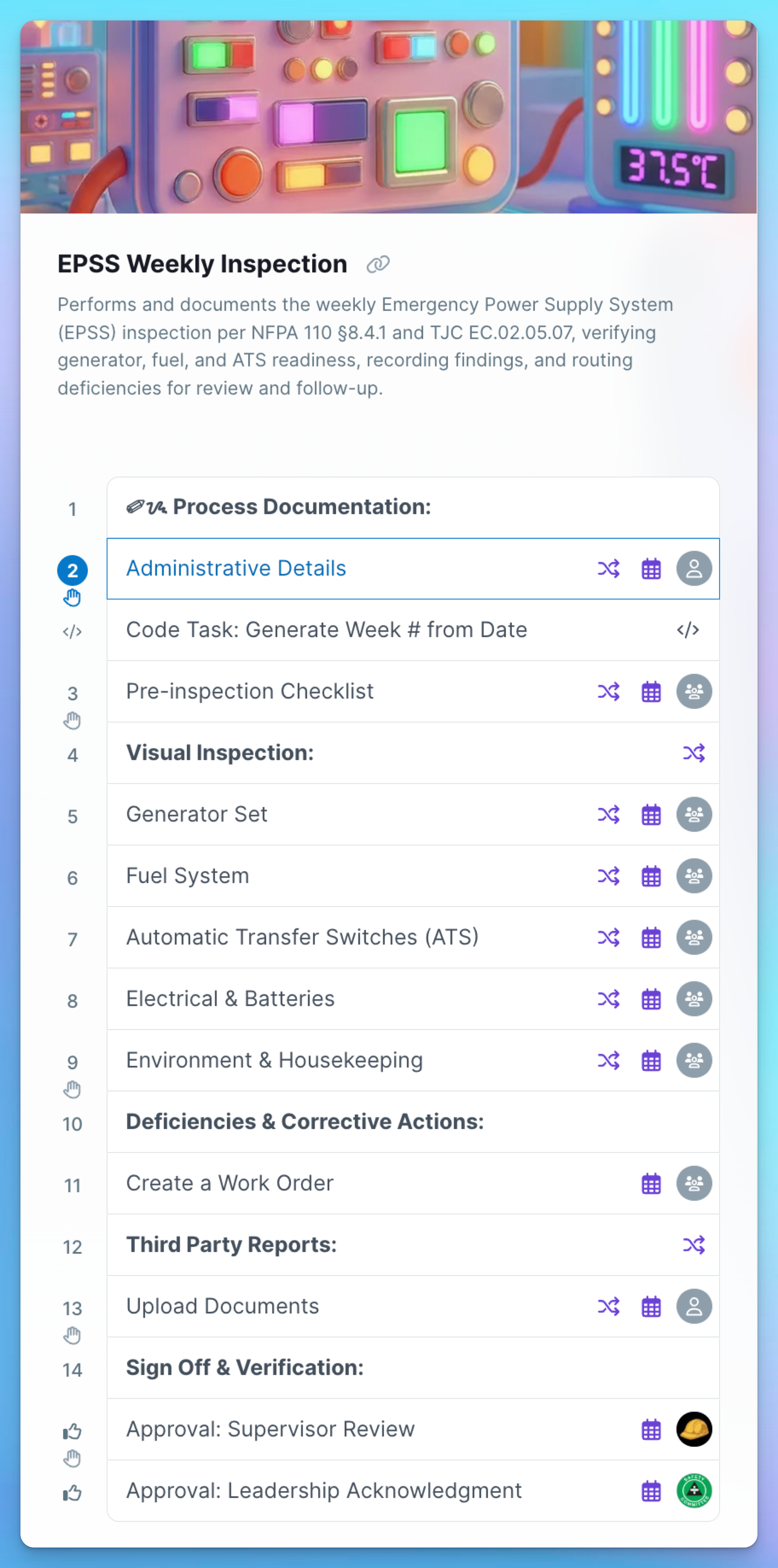 A reliable emergency power testing program doesn't rely on memory or spreadsheets. It’s built on clear strategy, structured workflows, automation, and intelligent support. Here’s how Process Intelligence simplifies compliance: