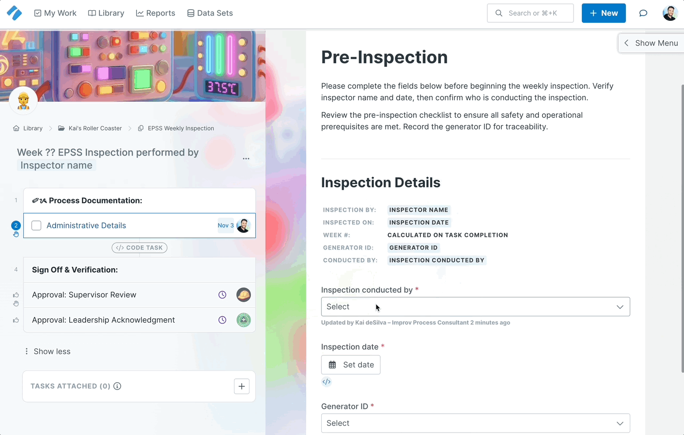 Required fields and logic: Force completeness with mandatory data and hide irrelevant tasks using conditional prompts.